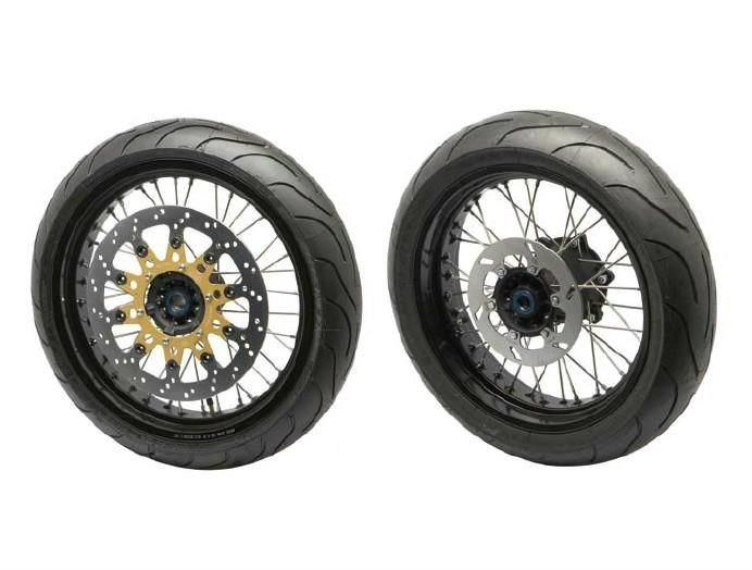 Pareja de ruedas completas de supermotard con bujes y aros negro.